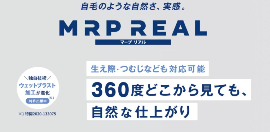 アートネイチャーの「マープ リアル(MRP REAL)」 は、 結び目を極小化させ、自身の髪の毛への負担を減らしつつも自然なボリュームを実現することに成功しました。そこには、独自の「ウェットブラスト加工」を進化させた技術(特開2020-133075)が活かされています。